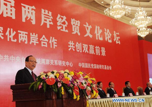 Kuomintang (KMT) Vice Chairman Chiang Hsiao-yen reads the forum proposal at the conclusion ceremony of the Cross-Strait Economic, Trade and Culture Forum, a regular forum between the Chinese mainland and Taiwan, in Chengdu, capital of southwest China's Sichuan Province, May 8, 2011. Jia Qinglin, member of the Standing Committee of the Political Bureau of the Communist Party of China (CPC) Central Committee, and Kuomintang (KMT) honorary chairman Wu Poh-hsiung attended the ceremony Sunday. (Xinhua/Rao Aimin)