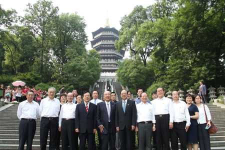 Kuomintang (KMT) Chairman Wu Poh-hsiung and his companies pose for a group photo during their visit to the Leifeng Pagoda in Hangzhou, capital of east China's Zhejiang Province, on May 29, 2009. (Xinhua/Xing Guangli)