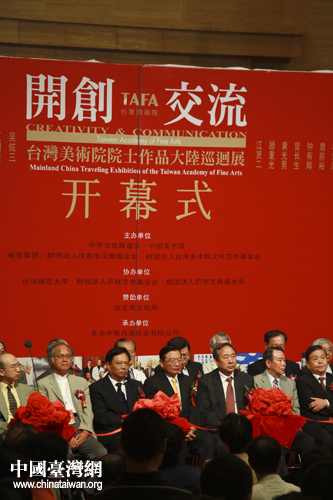 中國(guó)臺(tái)灣網(wǎng)8月22日北京消息 22日上午,由中華文化聯(lián)誼會(huì)、中國(guó)美術(shù)館、臺(tái)灣沈春池文教基金會(huì)、臺(tái)灣美術(shù)院文化藝術(shù)基金會(huì)主辦的《開(kāi)創(chuàng)·交流——臺(tái)灣美術(shù)院院士作品大陸巡回展》在北京中國(guó)美術(shù)館隆重開(kāi)幕。臺(tái)灣海基會(huì)董事長(zhǎng)江丙坤、中華文化聯(lián)誼會(huì)顧問(wèn)周和平、全國(guó)臺(tái)灣同胞聯(lián)誼會(huì)會(huì)長(zhǎng)梁國(guó)揚(yáng)、海協(xié)會(huì)副會(huì)長(zhǎng)王富卿等兩岸各界嘉賓300余人出席了展覽開(kāi)幕式。
