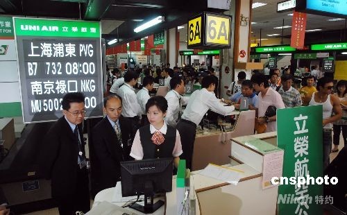 7月4日,臺灣立榮航空首班周末包機上午八時首航臺北到上海,臺灣松山機場柜臺看板首次顯示出目的地上海。 中新社發 CNA 攝