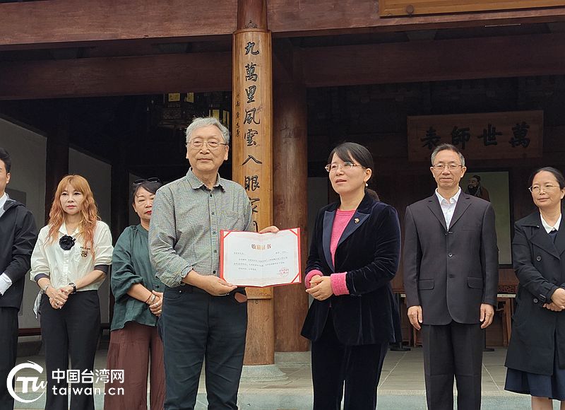 浦江縣檔案館為旅臺畫家任墨蓉女士之子洪其祥先生頒發收藏證書。(中國臺灣網發)