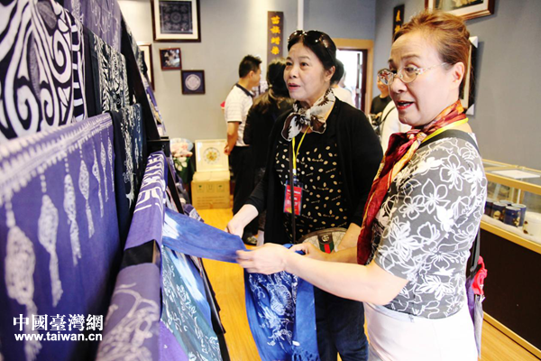 參訪團成員仔細端詳苗族蠟染。(圖片來源:宜賓市臺辦)