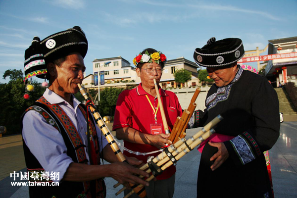 參訪團成員在苗族樂手指導下,學習吹奏蘆笙。(圖片來源:宜賓市臺辦)