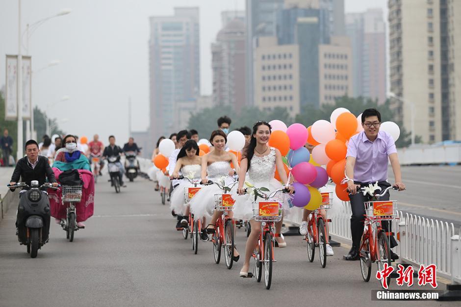5月20日,南京90后小伙張龔亦騎著公共自行車迎接新娘徐思圓,在當地公共自行車形象大使、江蘇廣播主持人楊曉的策劃組織下,在“520”(我愛你的諧音)這一天用綠色環保、低碳出行的方式來表達愛情,表達對生活的這座城市的熱愛。泱波 攝