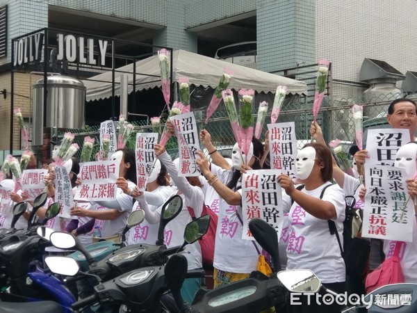 據報道,抗議慰安婦銅像遭踹,謝龍介率眾與臺南市慰安婦人權平等促進協會理事長黃淑貞從臺南北上,一行人身穿帶有“堅韌”字樣的白色T恤、戴白色面具,手持康乃馨,拿著“沼田干夫出來道歉”、“侵門踏戶”、“軟土深掘”的海報,要求臺當局“駐日代表”謝長廷要求日本政府道歉。