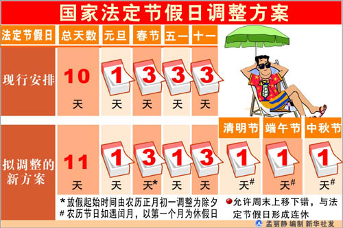 近日,國務院辦公廳發出通知,明確了2008年部分節假日的安排。通知指出,根據《國務院關于修改〈全國年節及紀念日放假辦法〉的決定》,為便于各地區、各部門及早合理安排節假日旅游、交通運輸、生產經營等有關工作,經國務院批準,2008年,元旦、春節、清明節、國際勞動節、端午節、中秋節、國慶節放假調休日期具體安排如下:
