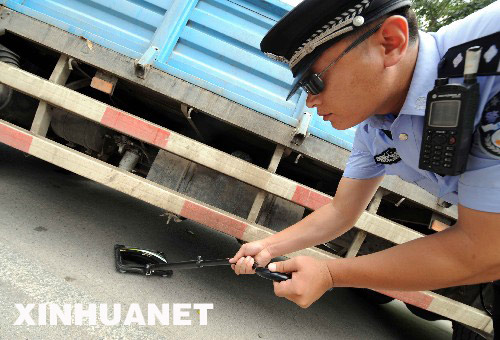 7月15日,北京警方在通州覓子店檢查站對車輛進行安全檢查,覓子店是天津、河北車輛進京的一個通道。當日上午9時,北京警方正式啟動巡邏防控“三道治安防線”,在與河北、天津等外省市接壤的第一道防線卡點將對進京車輛和人員實施安全檢查。 新華社記者 李文 攝