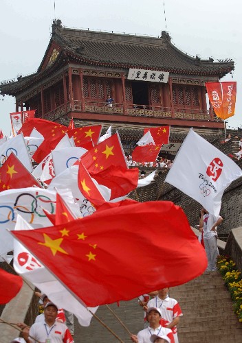 7月30日,人們在火炬?zhèn)鬟f起點(diǎn)老龍頭澄海樓前揮舞旗幟迎接圣火。新華社記者 鞏志宏 攝