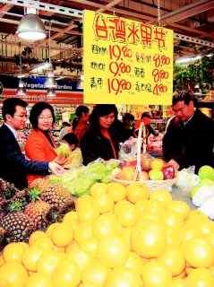 兩岸直接“三通”后航運時間縮短,運輸成本大降,上海超市趁勢推出“臺灣水果節”促銷葡萄柚、楊桃、釋迦、番石榴等臺灣水果。圖片來源:臺灣《聯合報》