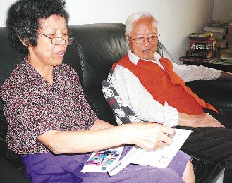 王俊嶸(右)與徐月美(左)夫婦保存著新疆女大學(xué)生唐紅寄來(lái)的信,看著她的成績(jī)單,兩人十分欣慰。臺(tái)灣《聯(lián)合報(bào)》記者翁禎霞攝