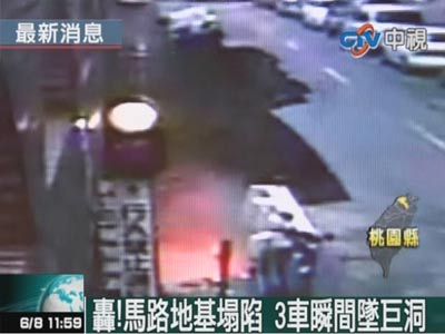 桃園市突現巨型“天坑”,3輛汽車瞬間墜入深坑,場面驚險。圖片來源:臺灣今日新聞網