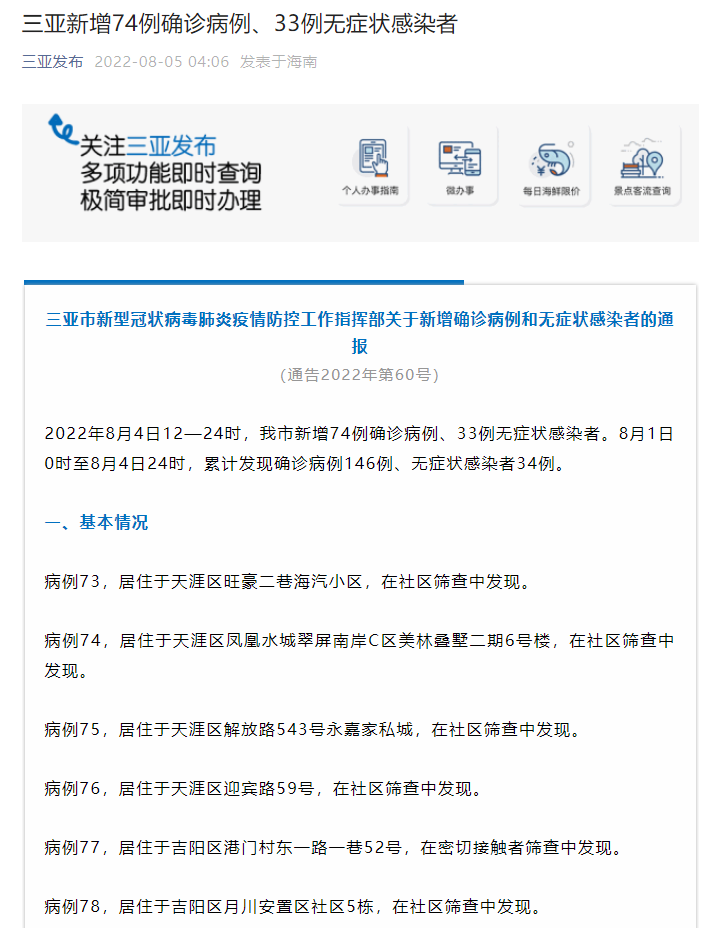 2022年8月4日12時—24時,三亞市新增74例確診病例、33例無癥狀感染者。8月1日0時至8月4日24時,累計發現確診病例146例、無癥狀感染者34例。