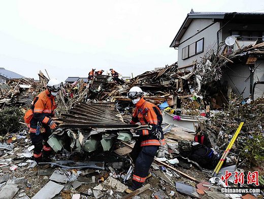 3月16日上午,日本救援隊(duì)伍在日本巖手縣大船渡市的“3.11日本東北大地震”引發(fā)的大海嘯襲擊后的災(zāi)區(qū)進(jìn)行搜救工作。中新社發(fā) 侯宇 攝