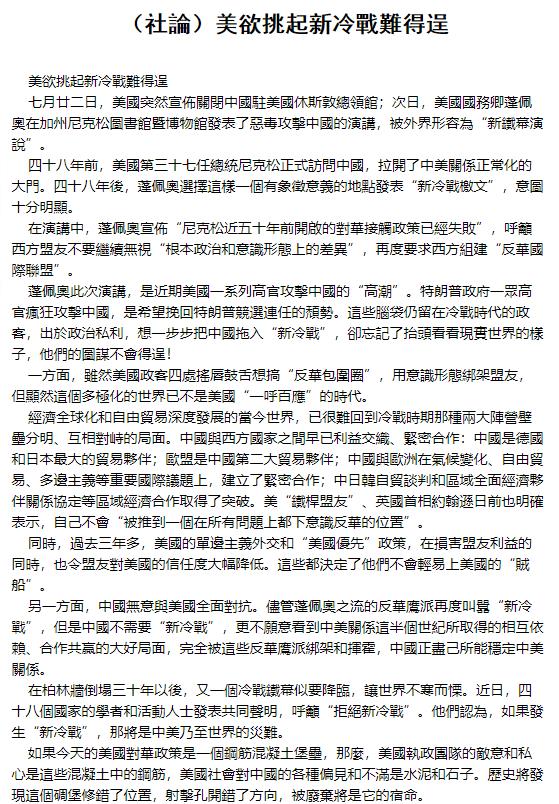 《澳門日?qǐng)?bào)》發(fā)表社評(píng)稱美欲挑起新冷戰(zhàn)難得逞