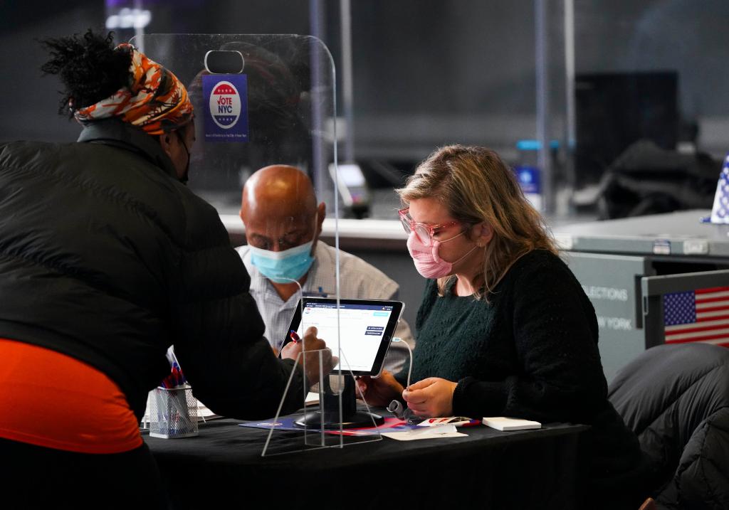 2020年11月3日,在美國紐約巴克萊中心的投票站,工作人員為選民辦理登記手續。(新華社記者王迎攝)