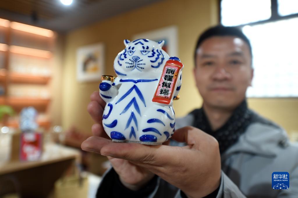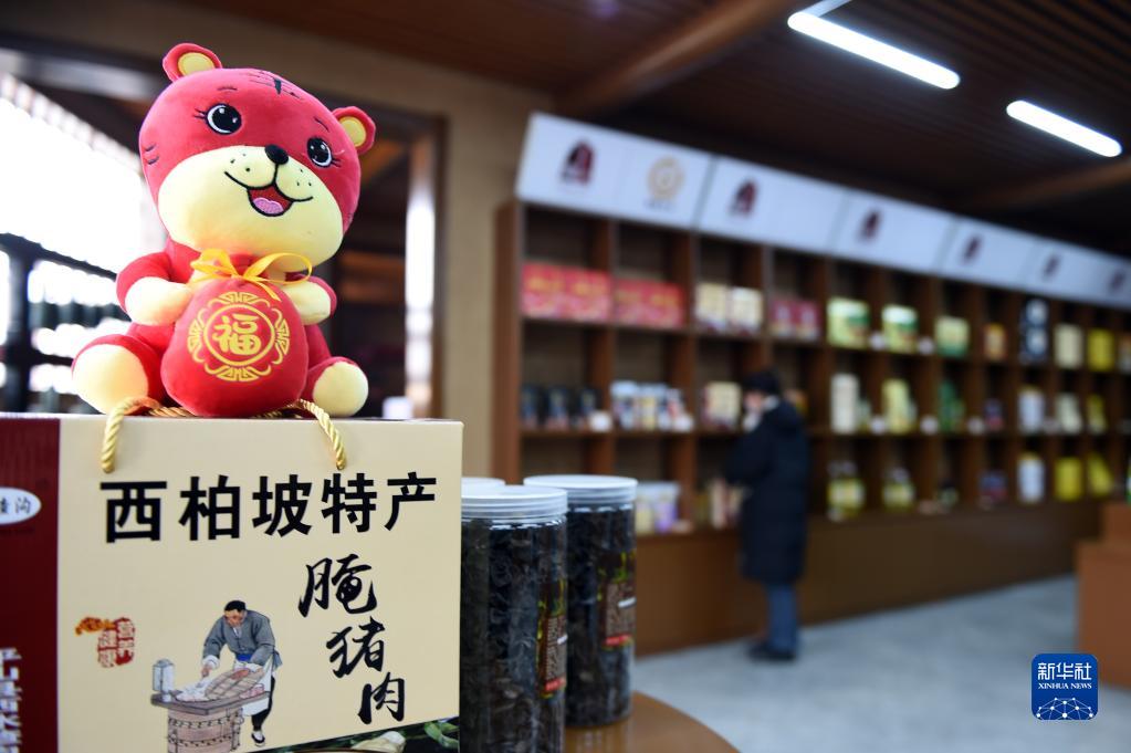 1月28日,在河北省平山縣西柏坡鎮北莊村西柏坡文創館,工作人員展示特色文創產品。新華社記者 駱學峰 攝