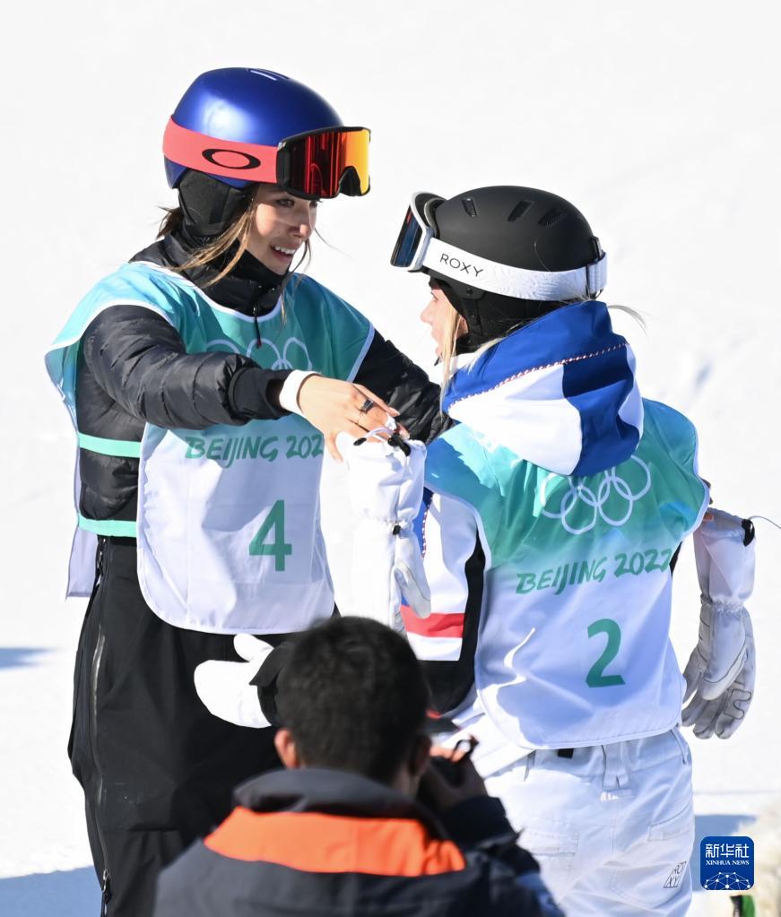 2月8日,中國選手谷愛凌(左)與法國選手泰絲·勒德在比賽后相互祝賀。