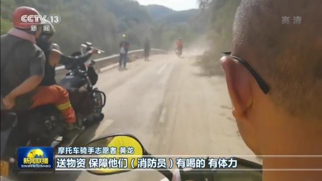 在專業力量投入的同時,很多志愿者加入進來,他們搬運物資、協助疏散交通,主動為應急人員提供幫助。由于山區深處的火場,道路狹窄崎嶇,只能依靠越野摩托車進入,許多越野摩托車友們就自發為救援隊伍運送物資。