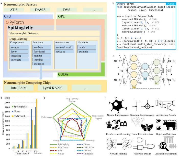 “驚蜇”(SpikingJelly)框架的整體結構、示例代碼、仿真速度、生態位以及典型應用。中國科學院自動化所 供圖