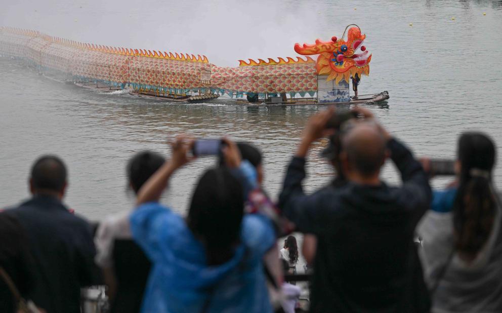 5月31日,在重慶市銅梁區安居古城,觀眾觀看“神龍攬勝”游江表演。
