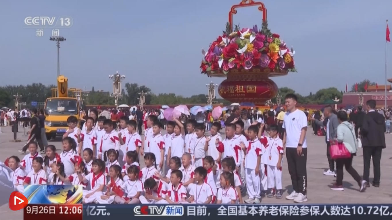 為迎接國慶,北京天安門廣場及長安街沿線花卉景觀布置基本就緒。9月25日,天安門廣場中心花壇盛裝亮相。今年廣場花卉布置以“奮進新征程,建功新時代”為主題,中心花壇頂高18米。以高16米、直徑12米的“祝福祖國”巨型花籃為主景。其中,加大了鳶尾、翠菊、珙桐、橄欖枝等新型花材的使用。此外,還有寓意和美的荷花、以及寓意奮進的山丹丹等花卉,表達美好祝愿。