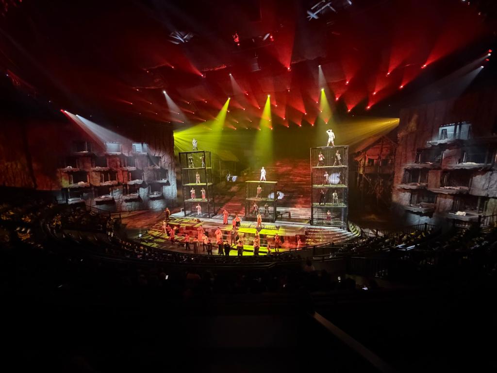 上一秒還是重慶熙攘的街頭巷陌,隨著舞臺(tái)和觀眾席的緩緩旋轉(zhuǎn),場(chǎng)景無縫切換至渣滓洞監(jiān)獄!皹屄暋睆亩下舆^,座椅隨“炮聲”震顫,燈光模擬出天邊破曉和熊熊火光……觀眾仿佛被拉回到1949年的山城。