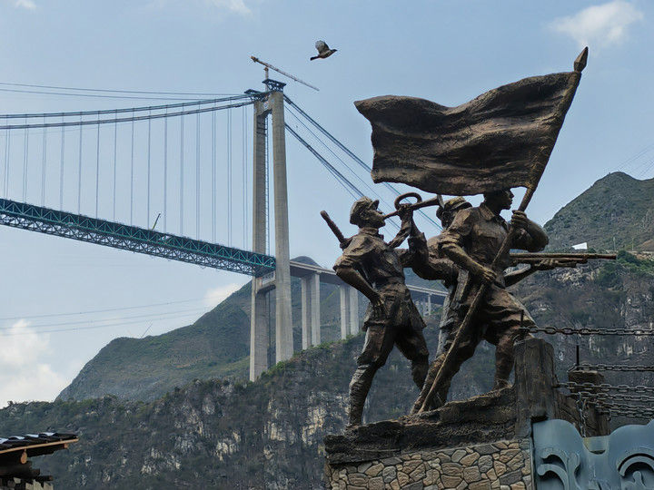 這是2025年4月28日拍攝的貴州花江峽谷大橋。9月28日,新的世界第一高橋——貴州花江峽谷大橋建成通車。近處的則是一座建于1898年、由14根鐵鏈組成的花江鐵索橋。1935年4月,中央紅軍右路縱隊挺進黔西南,死守花江鐵索橋這一戰略要沖,確保紅軍主力順利搶渡北盤江。新舊兩座橋,橫跨著百年歷史風云,見證著血與火的艱辛歷程。