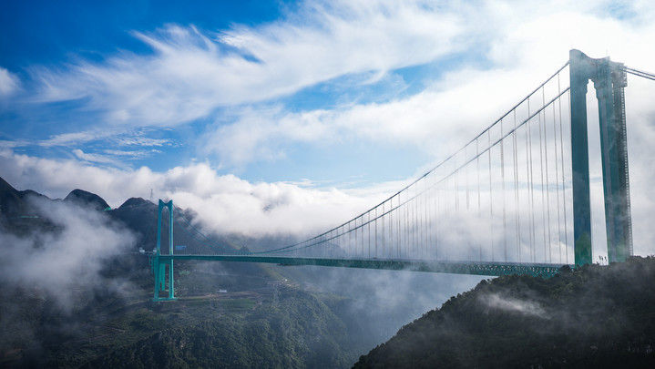 2025年9月28日,世界第一高橋——貴州花江峽谷大橋建成通車。花江峽谷大橋是貴州六枝至安龍高速公路的控制性工程,大橋全長2890米,主跨徑1420米,是目前世界山區峽谷第一大跨度鋼桁梁懸索橋;其橋面距水面垂直高度625米,是新的世界第一高橋。