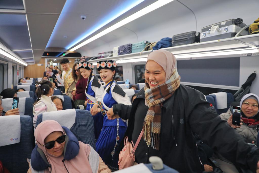 11月22日,在麗香鐵路動車組列車上,東南亞游客與身著民族服飾的乘務員一同跳舞。新華社發(楊紫軒攝)