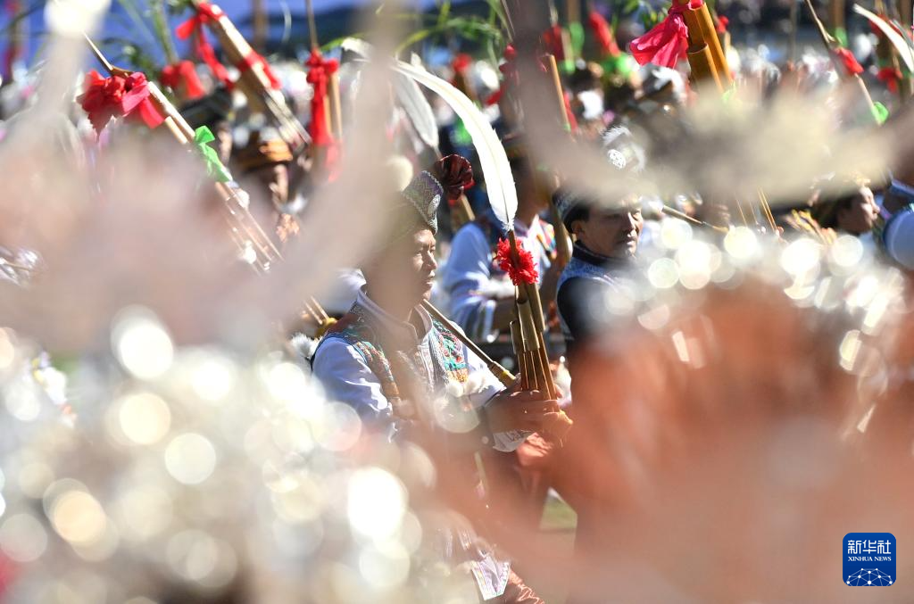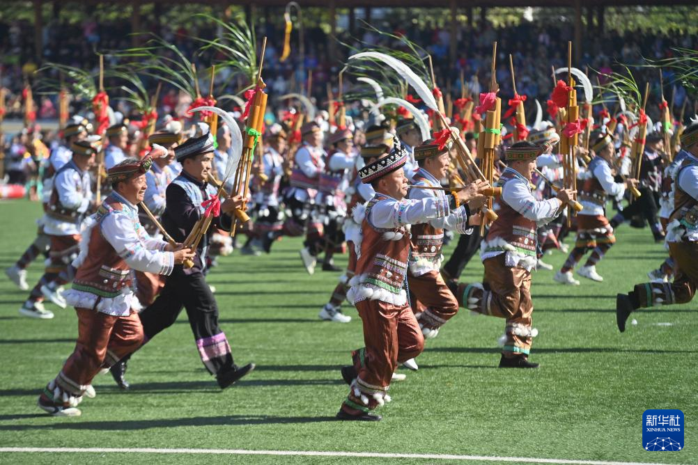 11月29日,表演者在融水縣民族體育公園舉行的蘆笙斗馬節開幕式現場吹奏蘆笙。