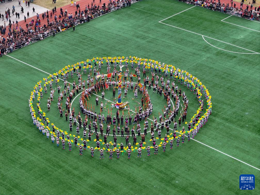 11月29日,表演者在融水縣民族體育公園舉行的蘆笙斗馬節開幕式現場表演蘆笙踩堂(無人機照片)。