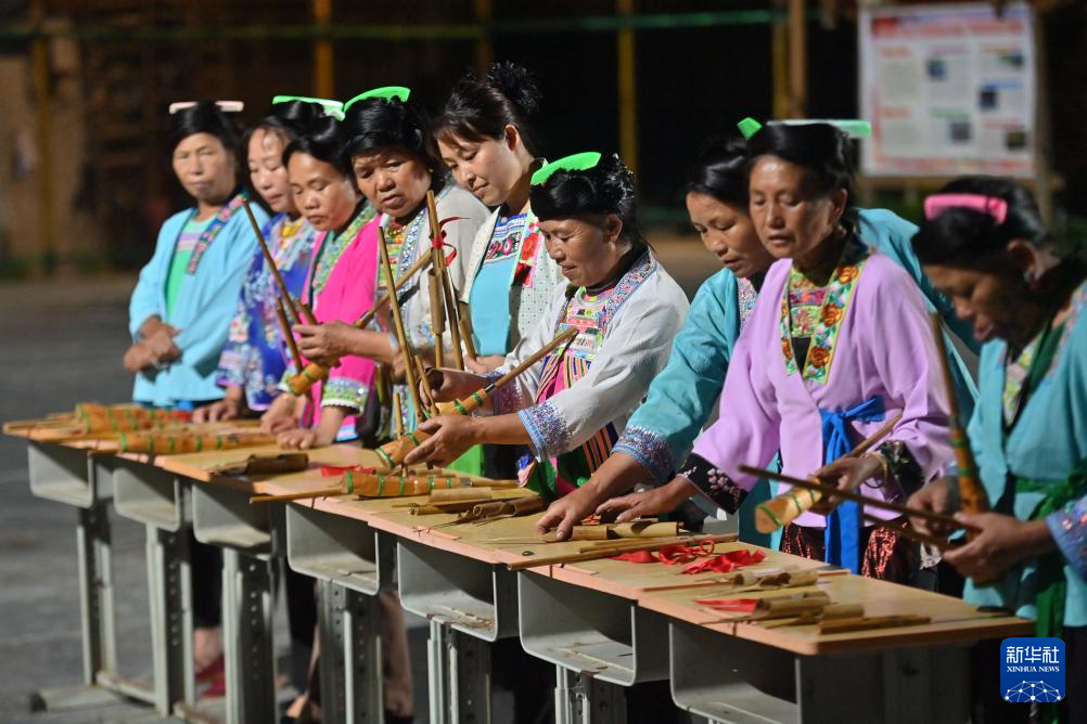 在融水縣桿洞鄉黨鳩村夜校課堂上,婦女們參加蘆笙組裝比賽(2024年7月11日攝)。