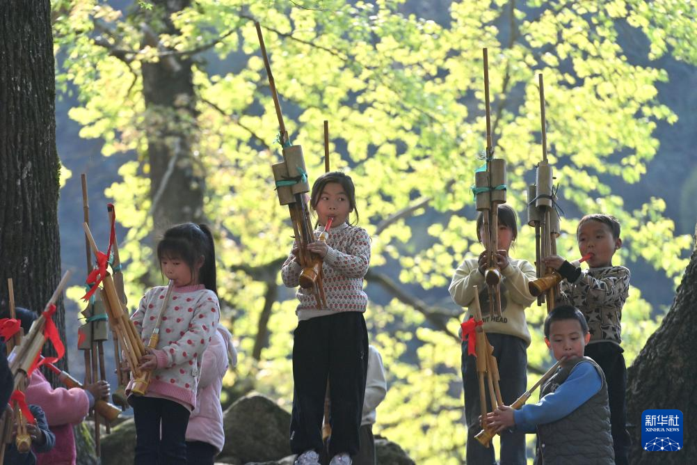 在融水縣桿洞鄉黨鳩村,小學生在“蘆笙文化進校園活動”中吹奏蘆笙(2025年3月28日攝)。