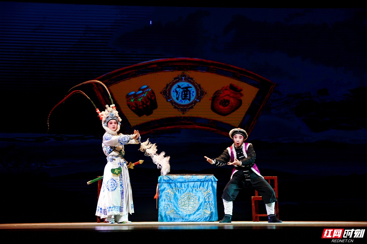 臺上,湘劇折子戲《攔馬》正演到酣處。楊八姐與焦光普在方桌之間騰挪跳躍,高難度的“盜牌”舞蹈與椅子功引得臺下掌聲不斷。