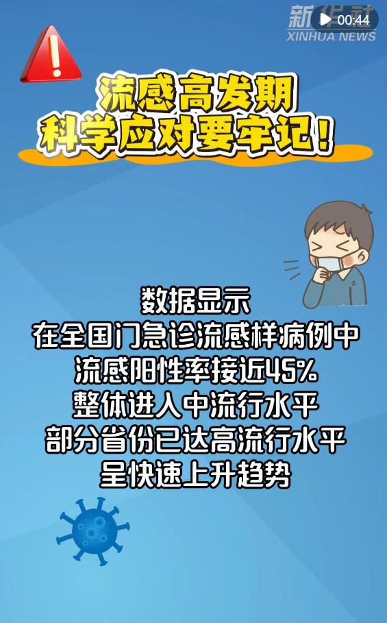 近日,中國疾病預防控制中心發布數據顯示,在全國門急診流感樣病例中,流感陽性率接近45%,整體進入中流行水平,部分省份已達高流行水平,呈快速上升趨勢。如何科學應對流感,點擊視頻了解。
