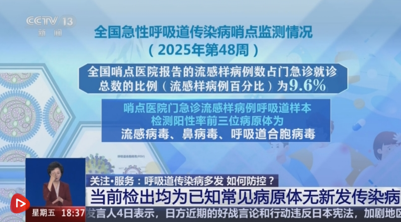 央視網消息:中國疾控中心12月4日發布,全國急性呼吸道傳染病哨點監測情況顯示,全國哨點醫院報告的流感樣病例數占門急診就診總數的比例(也就是流感樣病例百分比)為9.6%。哨點醫院門急診流感樣病例呼吸道樣本檢測陽性率前三位病原體為流感病毒、鼻病毒、呼吸道合胞病毒。當前,檢出均為已知常見病原體,沒有發現未知病原體及其導致的新發傳染病。