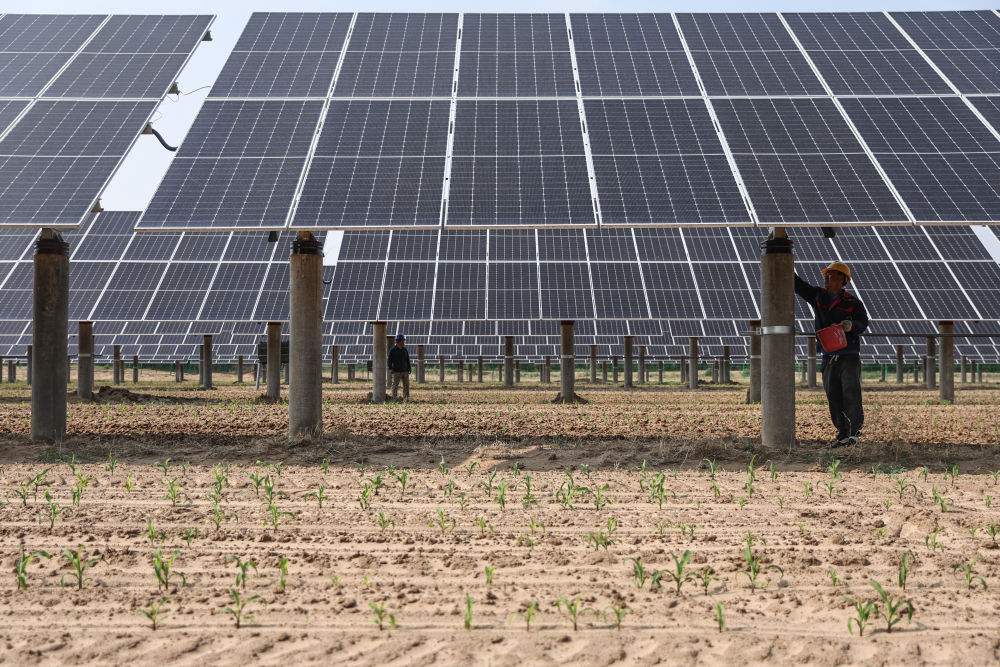 2025年5月29日,工作人員在遼寧彰武縣章古臺(tái)鎮(zhèn)光伏+治沙生態(tài)產(chǎn)業(yè)項(xiàng)目現(xiàn)場(chǎng)對(duì)光伏板進(jìn)行維護(hù)。新華社記者 潘昱龍 攝