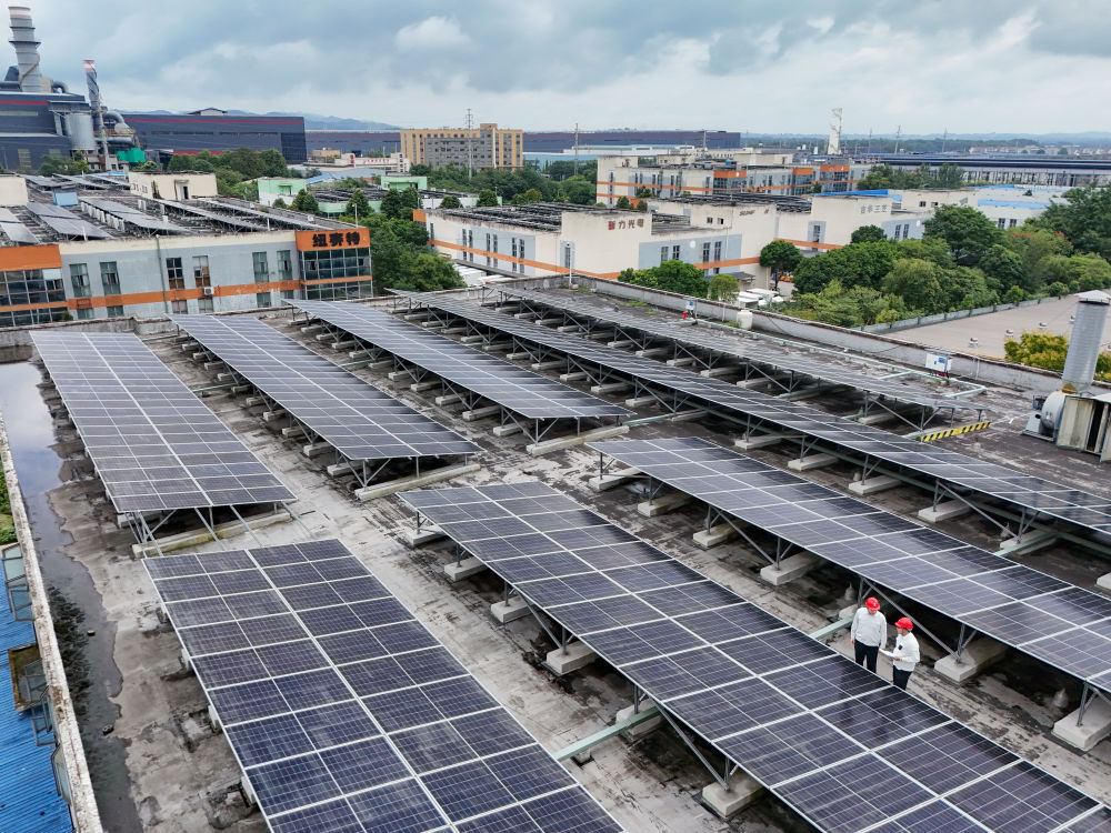 9月17日,在四川都江堰經濟開發區,朱鵬宇(左)和同事檢查工業用戶新裝屋頂光伏板情況(無人機照片)。新華社記者 王曦 攝