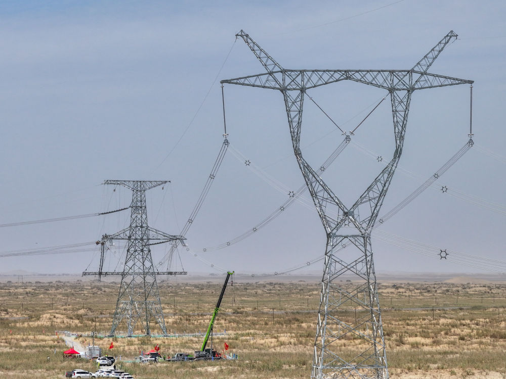 2025年7月13日,在塔里木盆地南緣的新疆和田地區民豐縣,隨著牽引機將最后一段電線成功從183號鐵塔拽至188號鐵塔,歷時15年建設的環塔里木盆地750千伏輸變電工程全線貫通(無人機照片)。新華社記者 丁磊 攝