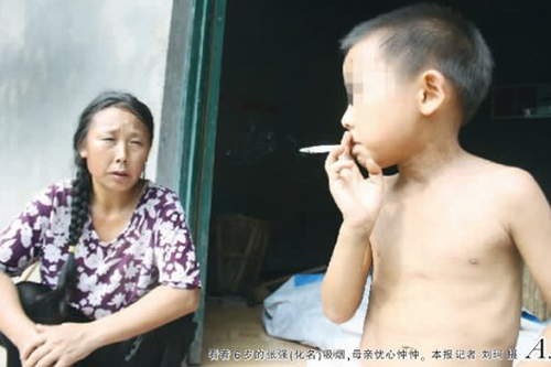 與其他同齡人相比,張強明顯長得要矮一些,稀疏的頭發又黃又短。張強的母親說,平時孩子雖然也要吃三頓飯,但每頓飯只是匆匆吃完一碗即說不餓,常常是丟下飯碗就不見了。再一找,他躲在屋后一手拿煙,一手捧個茶杯,儼然一副小大人模樣。