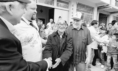 10月17日,湖北省監(jiān)利縣周老嘴鎮(zhèn)羅家村,當年參與營救本尼達的農(nóng)民周孝漢(前排右二)來到現(xiàn)場,本尼達的兒子愛德華(左一)上前熱情地握住他的手表示感謝。