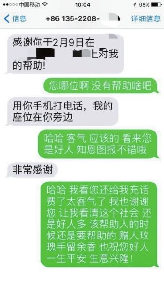 昨天上午,張先生收到了陌生人的100元話費充值。詢問之下,張先生得知,這是2月9日,向他借手機的一位徐先生向他表示感謝的。徐先生認為,在素不相識的情況下,張先生愿意借手機給自己很難得。