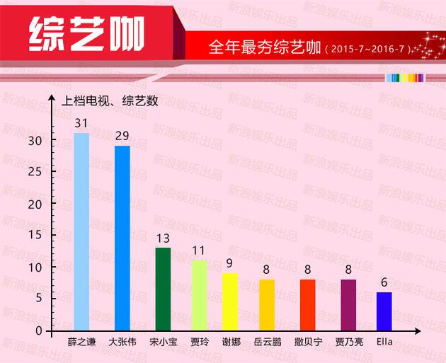 當我們討論一個藝人究竟算不算綜藝圈兒里的大紅人時,先看看到底有多少檔節目愿意請他去做嘉賓吧!這是最簡單直觀的。在此,我們以“年”為單位(去年7月左右-今年7月),把一年內上檔(或已錄完,即將上檔)的電視、網絡綜藝進行了一番梳理,以下幾位便是獲邀參與綜藝節目數量最多的紅人兒。