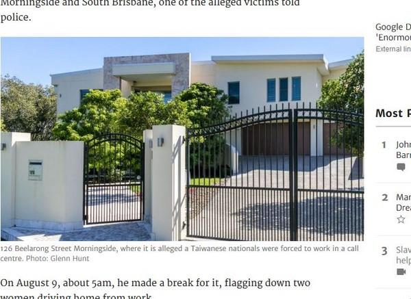 據(jù)香港《東方日?qǐng)?bào)》網(wǎng)站4月19日?qǐng)?bào)道,被困的臺(tái)灣人戴友庭(音譯)去年8月9日清晨,從布里斯班市中心附近的豪宅出逃求助。警方獲悉事件后展開行動(dòng),在豪宅救出23名受害者,隨后再于南布里斯班另一幢“奴隸屋”救出35人。