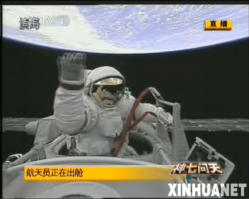 2008年9月27日,執行神舟七號載人航天飛行出艙活動任務的航天員翟志剛出艙后揮手致意。 新華社發(電視截圖)