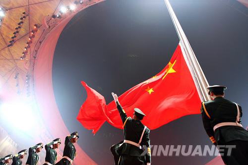 2008年8月8日,第29屆夏季奧林匹克運動會在國家體育場隆重開幕。這是中華人民共和國國旗在國家體育場升起。新華社記者任隴攝