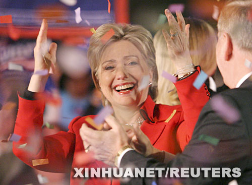 3月4日,在美國俄亥俄州首府哥倫布,來自紐約州的美國國會參議員希拉里與支持者慶祝預選勝利。 新華社/路透