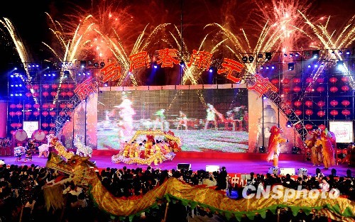 2月27日晚,正月十四。在福州馬尾舉行的第八屆“兩馬同春鬧元宵”活動開幕式民俗展演上,舞龍舞獅等傳統節目伴隨音樂焰火精彩呈現,拉開“兩馬同春鬧元宵”活動民俗展演序幕。當晚的民俗展演節目較往年更精彩,除舞龍舞獅等傳統節目外,極具地方特色的瑯岐肩頭戲、大頭娃娃、大鼓涼傘隊等均在展演上亮相。 中新社發 劉可耕 攝