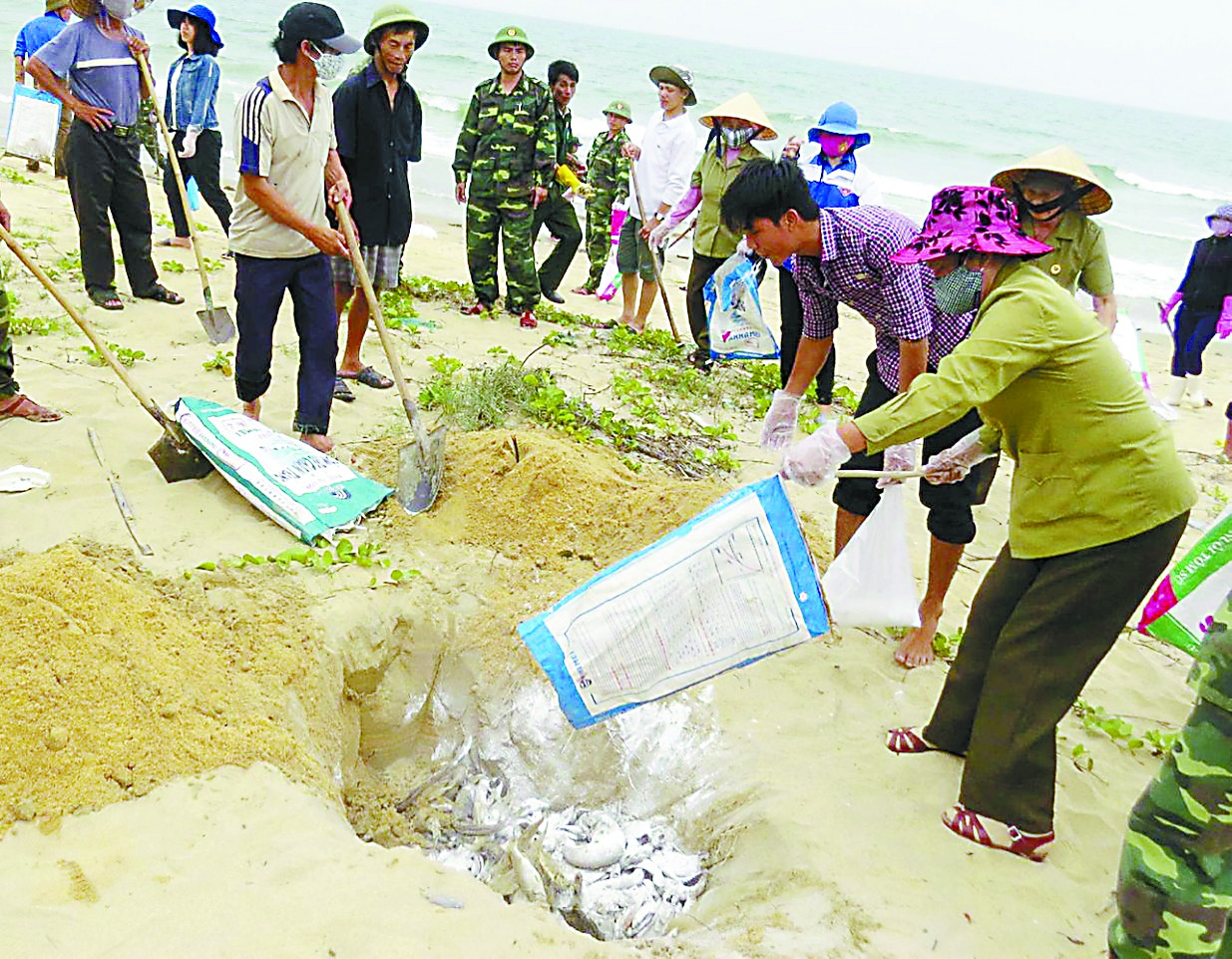 4月,越南漁民在海灘上掩埋死魚(yú)。臺(tái)塑集團(tuán)在當(dāng)?shù)赝顿Y的河靜大煉鋼廠被指制造了污染。