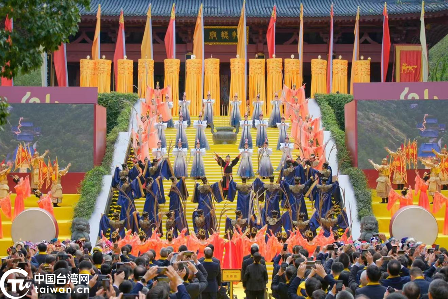 9時10分,參祭嘉賓身披黃色綬帶,在飛天廣場進行祭前序禮后,走過仰止亭、馭龍亭,進入黃帝祠宇,在軒轅殿前的祭祀大院整齊列隊,現場氣氛莊嚴、肅穆。大典共有長號鳴天、擊鼓撞鐘、敬上高香、敬獻花籃、敬獻美酒、恭讀祭文、行鞠躬禮、高唱頌歌、樂舞告祭等9項儀程。9時50分,寓意“九五至尊”,祭典正式開始。全體參祭人員肅立。隨著司儀宣布“長號鳴天”,9位號手長鳴5響嘹亮號聲拉開大典序幕,表達中華兒女對人文始祖軒轅黃帝無盡的追思之情。緊接著“擊鼓撞鐘”,34響鼓聲和15響鐘聲,象征全國34個省、直轄市、自治區、特別行政區,全世界15億炎黃子孫崇敬始祖的共同心聲,在群山環抱間久久回響。主祭人依次向軒轅黃帝敬上高香、敬獻花籃、敬獻美酒并恭讀祭文。全體參祭人員向軒轅黃帝行三鞠躬禮。祭典在氣勢恢宏的高唱頌歌和樂舞告祭中圓滿禮成。